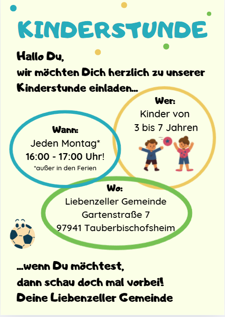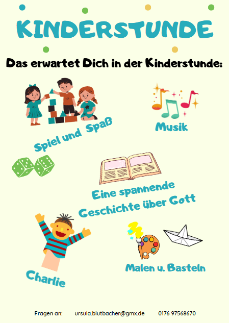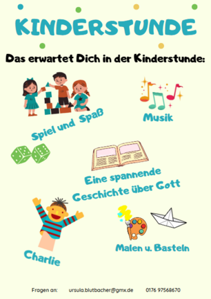 Die Kinderstunde findet jeden Montag von 16:00-17:00 Uhr in unseren Gemeinderäumen in der Gartenstr.7 statt